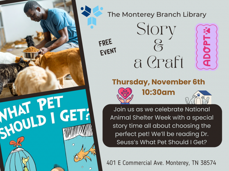 Storytime: National Animal Shelter Week - Thu, Nov 6, 2025 10:30am - 11:30am @ The Monterey Branch Library