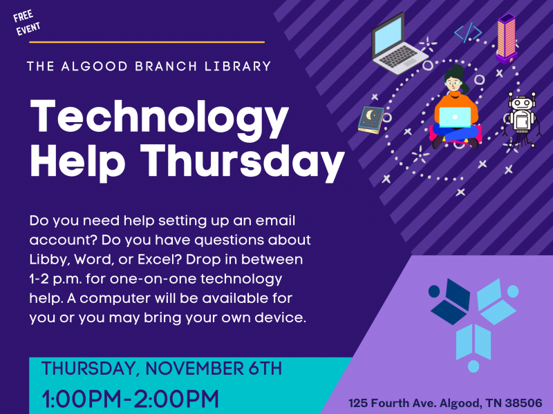 Tech Help Thursday - Thu, Nov 6, 2025 1:00pm - 2:00pm @ Algood Branch Library